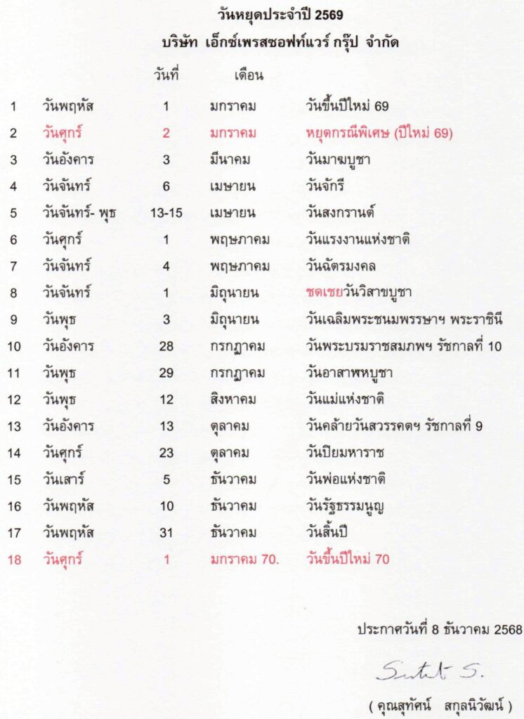 วันหยุดทำการประจำปีของบริษัทฯ